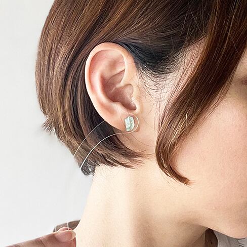 透明感と淡いブルーグリーンのバイカラーが楽しめるアクアマリン原石をピアスに仕立てました。