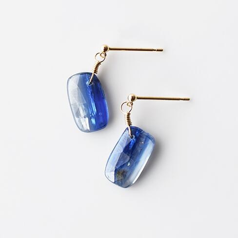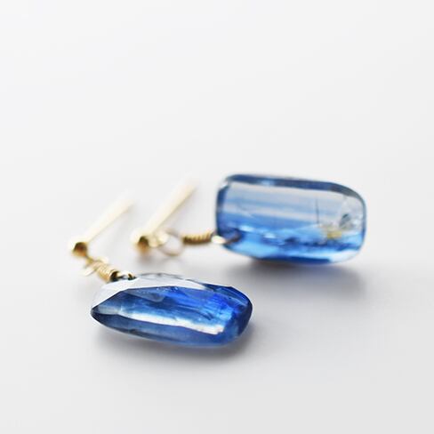 カイヤナイト特有の鮮やかなブルーとクリア部分の縞状の模様が美しいピアスです。