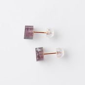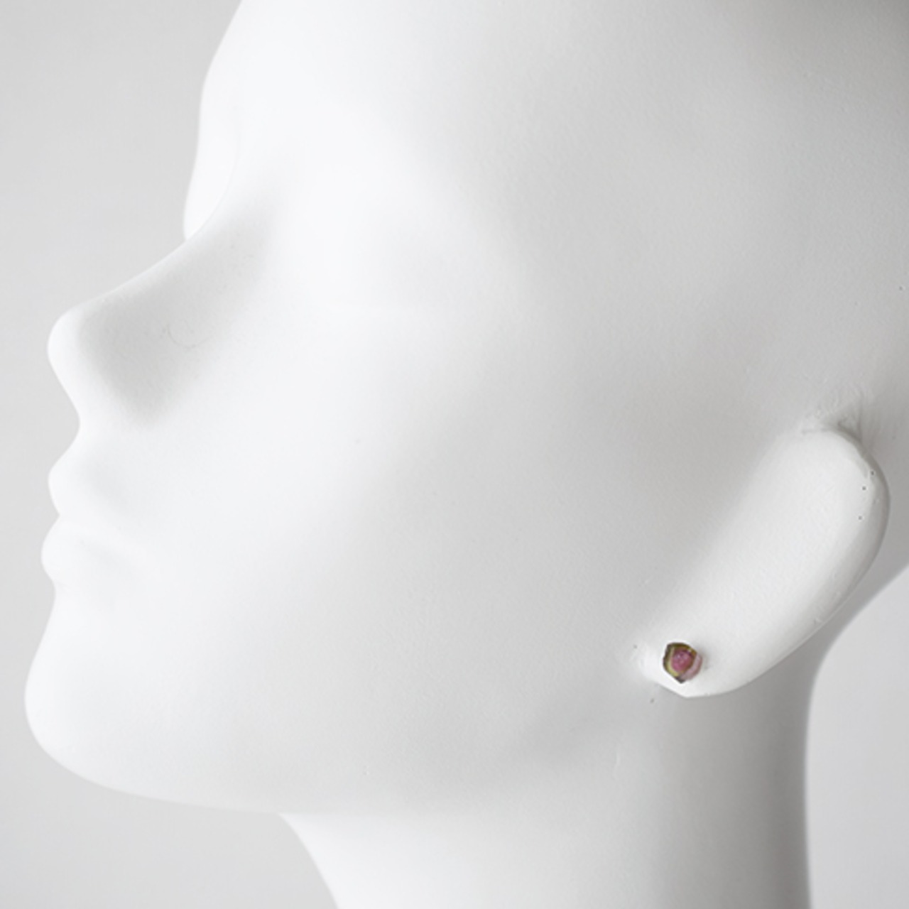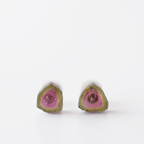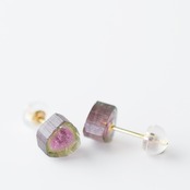 バイカラートルマリンの結晶をスライスしたユニークピースを用いてピアスを制作しました。